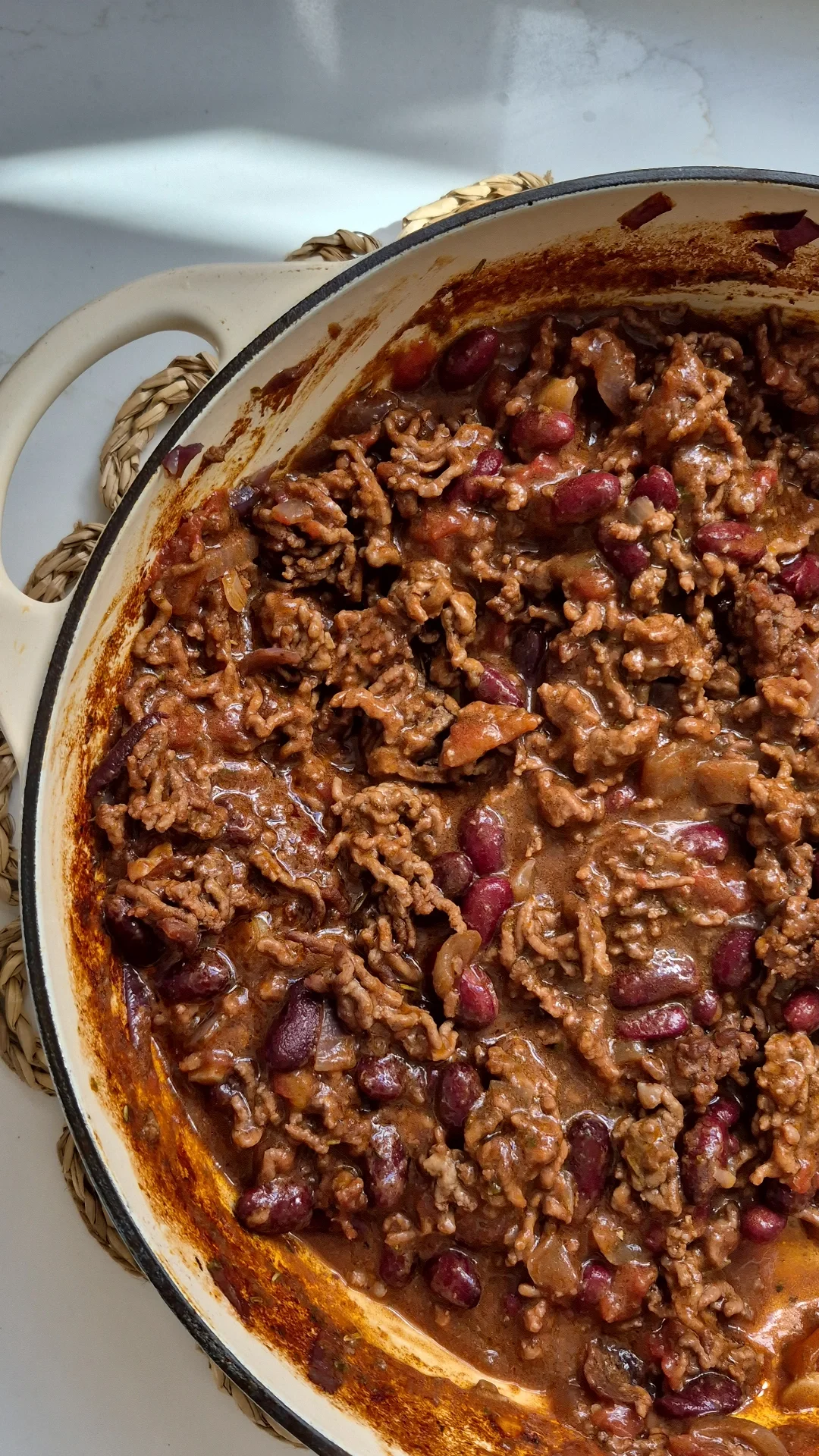 Chilli is one of the easiest, most nourishing meals to prep ahead, making it a real staple for busy weeks and especially supportive during the menstrual and luteal phases. It’s rich in protein, fibre, and slow-releasing carbohydrates, which help stabilise blood sugar and support steady energy when fatigue or cravings tend to be stronger. My chilli recipe is packed with iron-rich foods like beans and beef mince, which is particularly helpful during menstruation when we often need more iron. The warming, hearty nature of the dish makes it grounding and comforting, while ingredients like all the spices and herbs, tomatoes and garlic add antioxidants that support overall health and inflammation balance. I have also added a secret ingredient to my chilli, which is cacao (raw chocolate). It adds a bitter, richer flavour to the chilli, making it even yummier and it is full of important minerals such as magnesium and iron!